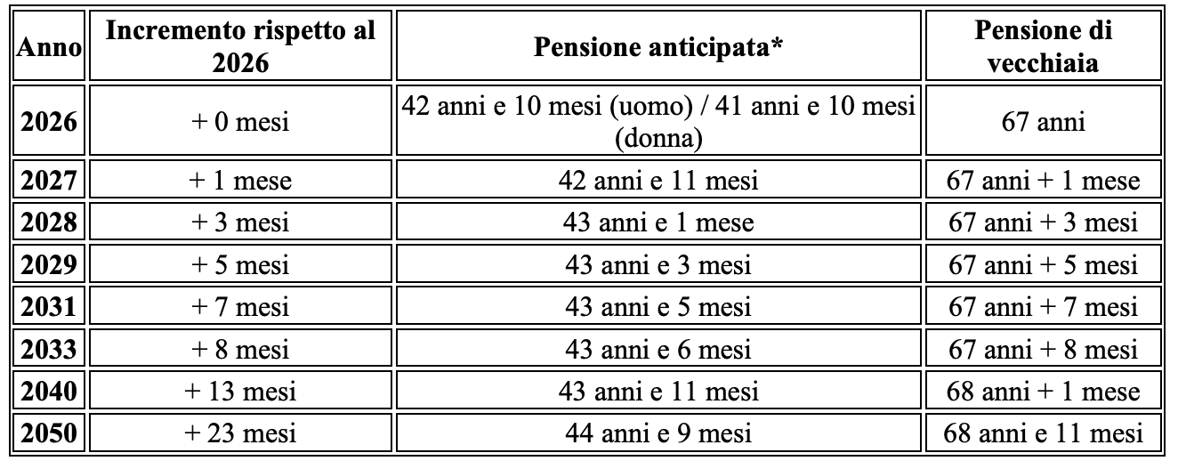 La Manovra non blocca il meccanismo di adeguamento all’aspettativa di vita. Dopo un incremento attenuato nel 2027 (+1 mese), dal 2028 gli aumenti tornano a regime: +3 mesi nel 2028, +5 mesi nel 2029, fino a +23 mesi nel 2050. Il risultato è che chi oggi ha redditi bassi dovrà lavorare settimane o mesi aggiuntivi solo per “recuperare” l’aumento previsto.