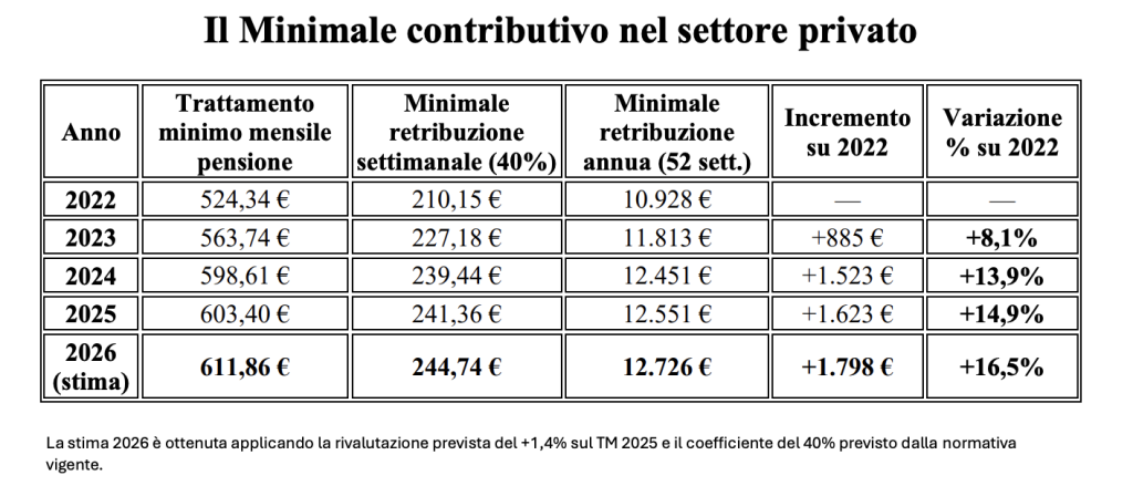 Dal 2022 al 2026 il minimale contributivo settimanale cresce del 16,5%, ben più dell’andamento delle retribuzioni. Questo disallineamento significa che, anche lavorando 12 mesi, un dipendente con redditi bassi può vedersi riconosciute solo una parte delle settimane utili.